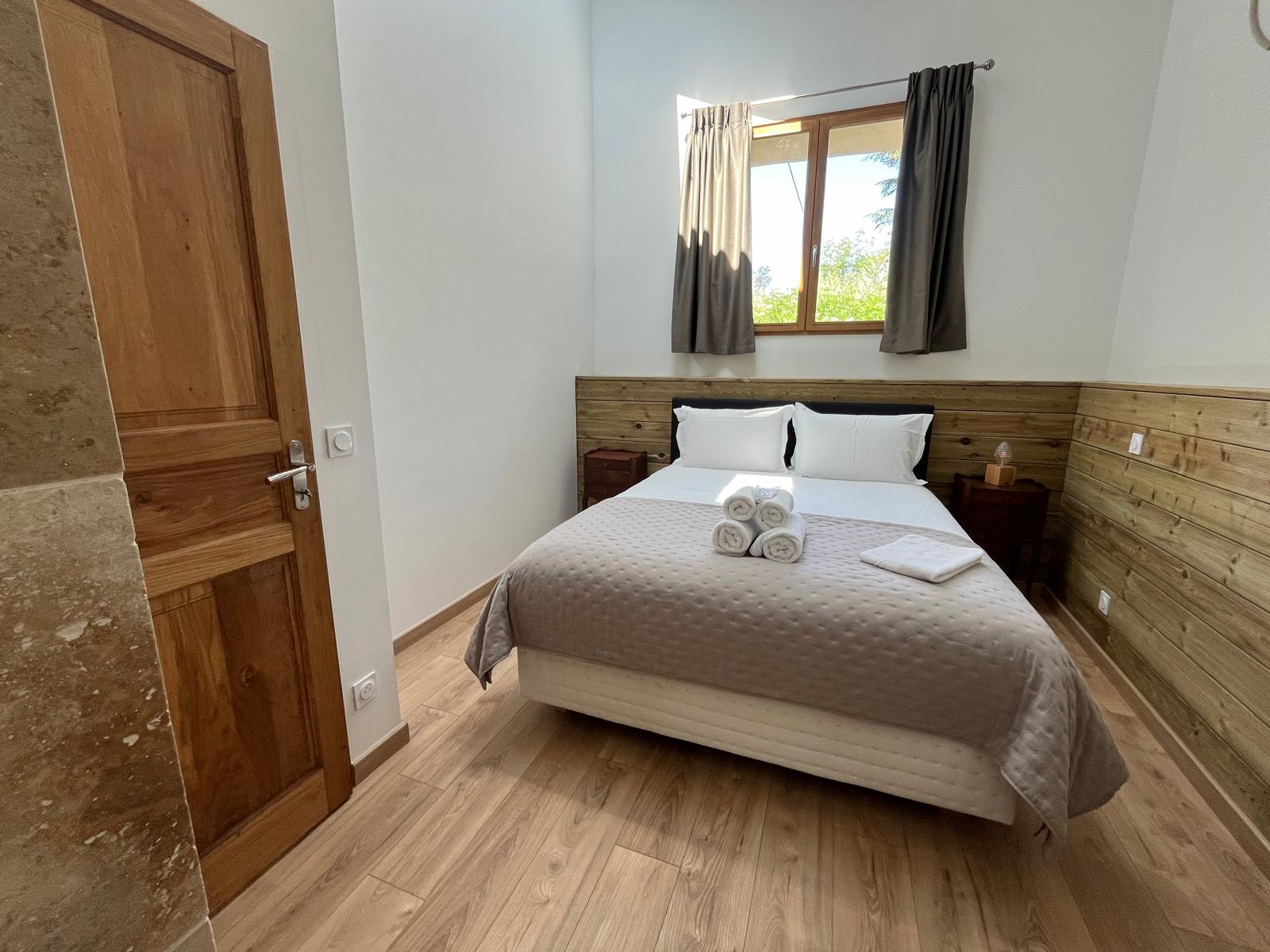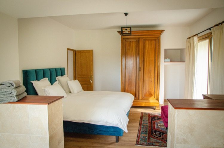 Chaque chambre, baignée de lumière naturelle, dévoile une atmosphère chaleureuse où le bois, la pierre et les couleurs profondes se rencontrent pour composer un écrin de sérénité.